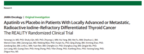 2021年12月16日,权威医学杂志《JAMA Oncology》(影响因子31.777)在线发表阿帕替尼的一项III期临床研究(REALITY)——甲磺酸阿帕替尼片治疗局部进展/转移性放射性碘难治性分化型甲状腺癌(RAIR-DTC)患者的多中心、随机、双盲、安慰剂对照临床研究。此研究由北京协和医院的林岩松教授和南京金陵医院的秦叔逵教授发起,在全国21个研究中心展开,由利来国际医药中央医学事务部团队支持完成。