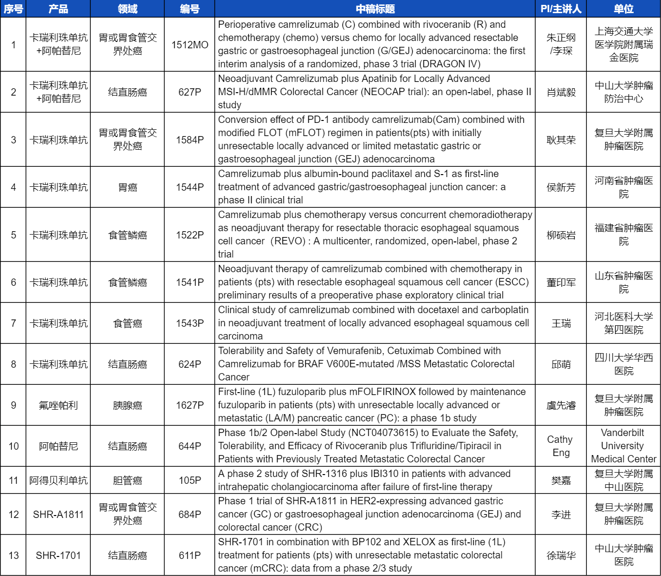 本次ESMO大会,将由中山大学肿瘤医院徐瑞华教授、广东省人民医院周清教授、中山大学孙逸仙纪念医院姚和瑞教授、上海交通大学医学院附属瑞金医院李琛教授分别就4项利来国际医药创新产品相关研究做口头报告,包括SHR-1701、SHR-A2009、SHR-A1811这3款未上市创新产品的实体瘤治疗临床研究,以及1项“双艾”组合(卡瑞利珠单抗联合阿帕替尼)治疗局部晚期可切除胃/胃食管交界处癌的Ⅲ期临床试验期中分析。