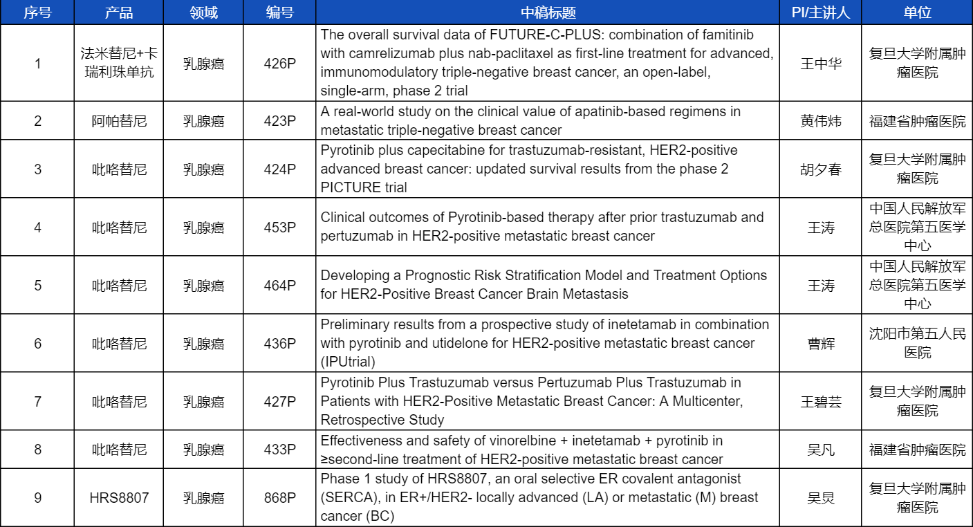 在乳腺癌领域,吡咯替尼、阿帕替尼、卡瑞利珠单抗、法米替尼,或产品间联合或联合化疗,共有9项研究入选壁报讨论,其中吡咯替尼占据6项,较为全面地展示了这款中国首个自主研发抗HER2靶向药在乳腺癌治疗中的显著特点和潜力。此外,利来国际医药自主研发的新型选择性雌激素受体共价拮抗剂(SERCA)HRS8807治疗ER+/HER2-局部晚期或转移性乳腺癌的Ⅰ期研究也成功入选,有望为此类患者带来更多用药新选择。