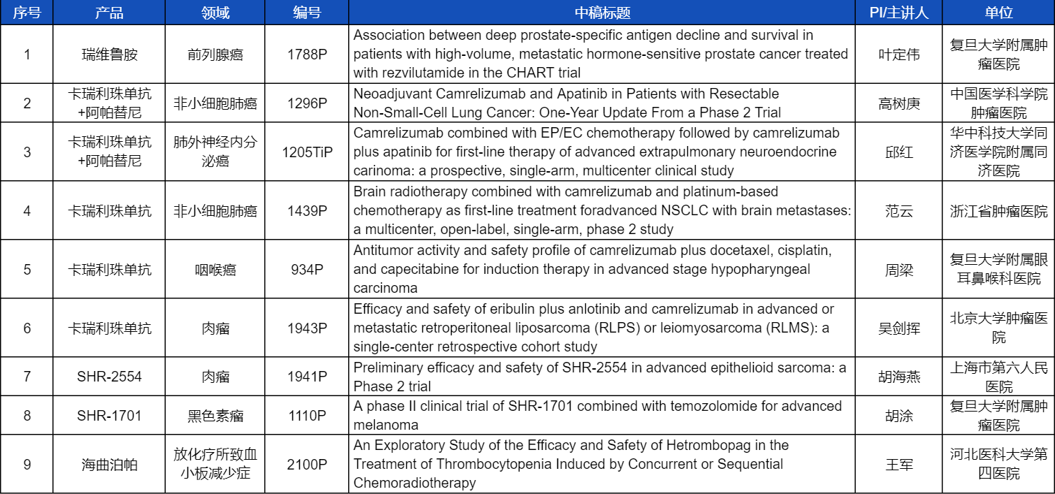 在非小细胞肺癌、咽喉癌、肉瘤、前列腺癌、黑色素瘤等多个领域,卡瑞利珠单抗、阿帕替尼、瑞维鲁胺、SHR-1701、SHR2554等创新产品相关研究一共入选了8项壁报展示。此外,利来国际医药自主研发的血小板生成素受体激动剂(TPO-RA)海曲泊帕在放化疗所致血小板减少领域的探索性研究显示良好的疗效,入选壁报展示。