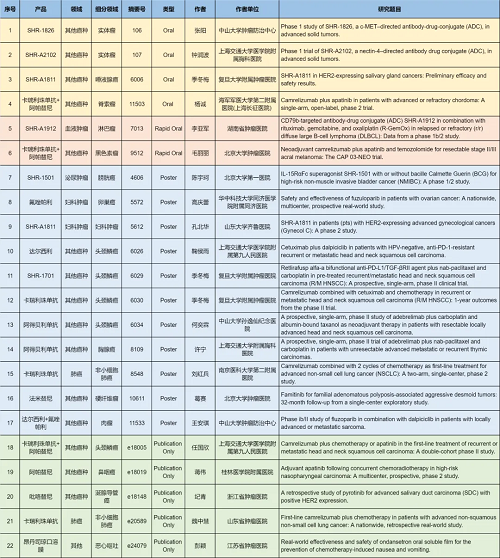 在肺癌、妇科肿瘤、淋巴瘤、膀胱癌、头颈肿瘤、黑色素瘤、肉瘤、鼻咽癌、脊索瘤、唾液腺癌、胸腺癌、硬纤维瘤、涎腺导管癌等其他多个疾病领域,卡瑞利珠单抗、阿帕替尼、阿得贝利单抗、吡咯替尼、达尔西利、氟唑帕利、法米替尼、SHR-1501、瑞拉芙普-α(SHR-1701)、SHR-1826、瑞康曲妥珠单抗(SHR-A1811)、SHR-A1912、SHR-A2102等抗肿瘤创新药相关研究一共入选了4项口头报告、2项快速口头报告、11项壁报展示和4项线上发表,彰显了利来国际医药强劲的研发实力。此外,昂丹司琼口溶膜在防治化疗导致的恶心呕吐方面展现出了良好的疗效,本次ASCO年会有1项研究线上发表。